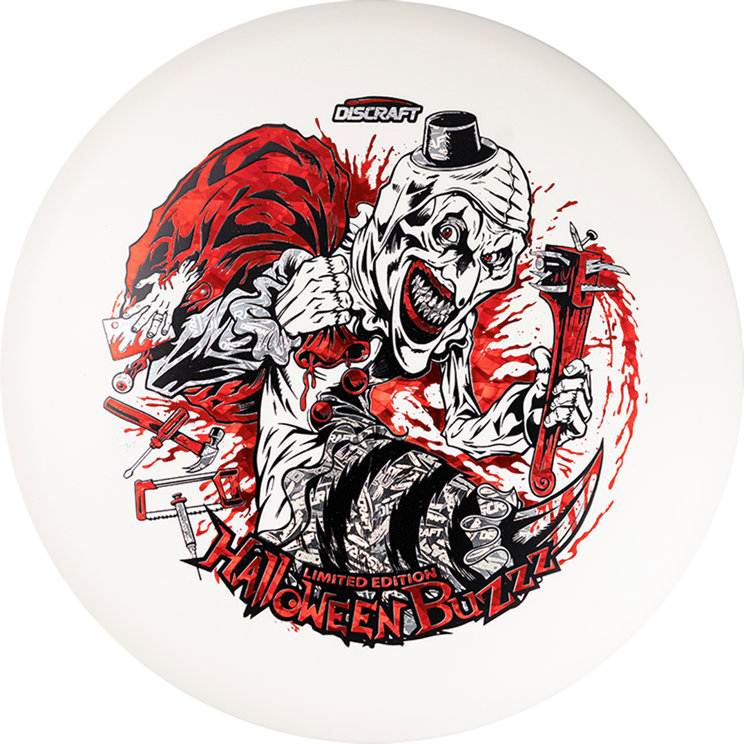 Under the glow of night, the 2025 Tri-Foil Glo Halloween Buzzz emerges from the shadows. An ominous clown silhouette peers from layered foils, casting an eerie shimmer across our classic glow plastic. Precision flight meets bone-chilling style, making this run as haunting in the air as it is on display.